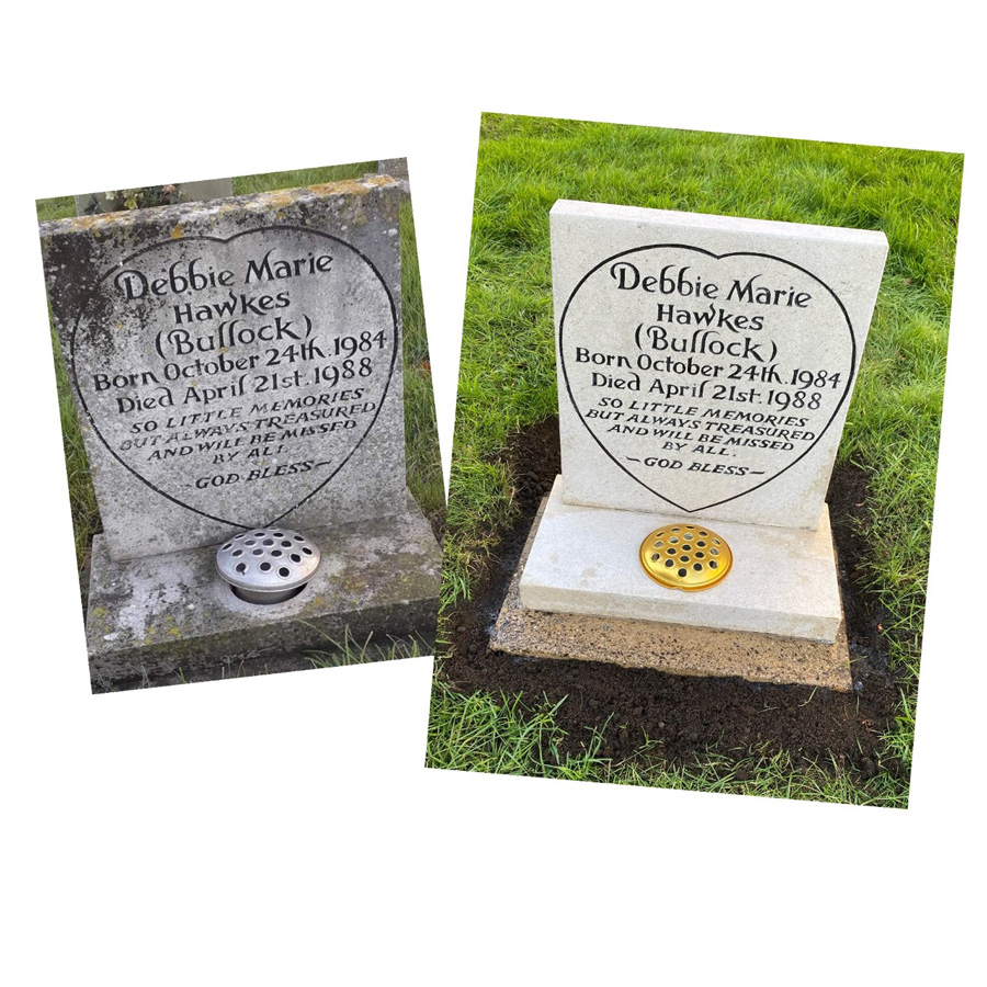 Our method of cleaning and restoration combines suitable chemical and mechanical techniques as approved by BRAMM (British register of memorial masons). Our specialist cleaning process removes dirt and any damaged surface of the stone which closes the pores, sealing the surface of the stone in a natural and healthy way. The correct application of specialist chemicals, if needed, are applied, and removed with expertise.